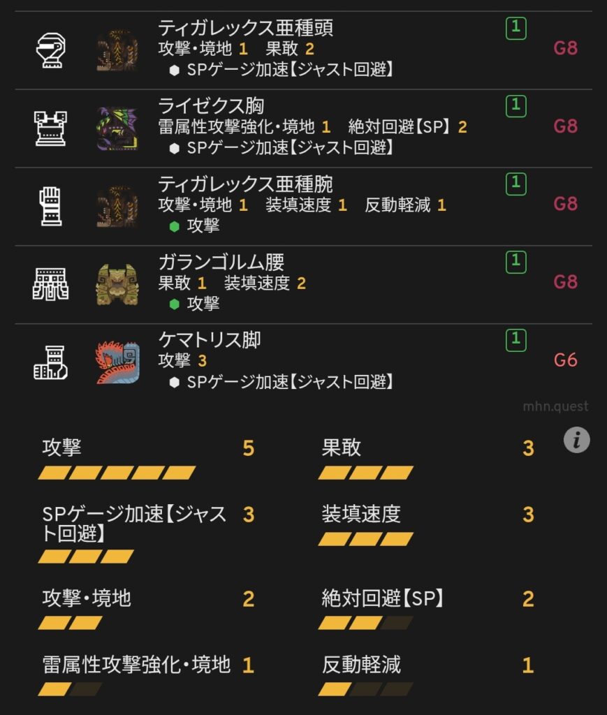 ラージャンヘビィ用にダメージUP系の要素を盛った装備です。頭で装填速度を稼いで砲術、足で反動軽減を稼いで雷属性UPがバッチリはまっていて個人的に気持ちいい構成にできたなと思ってます。全装備の中で一番稼働率が高いかもしれません。