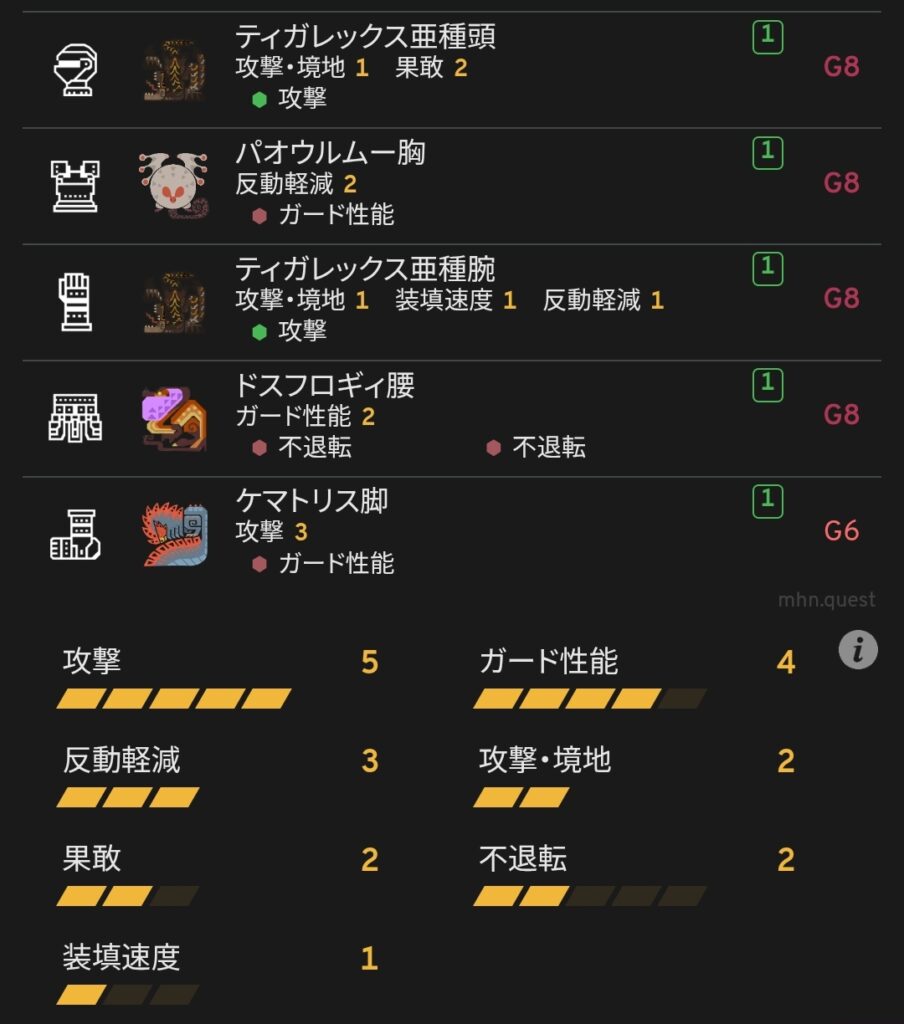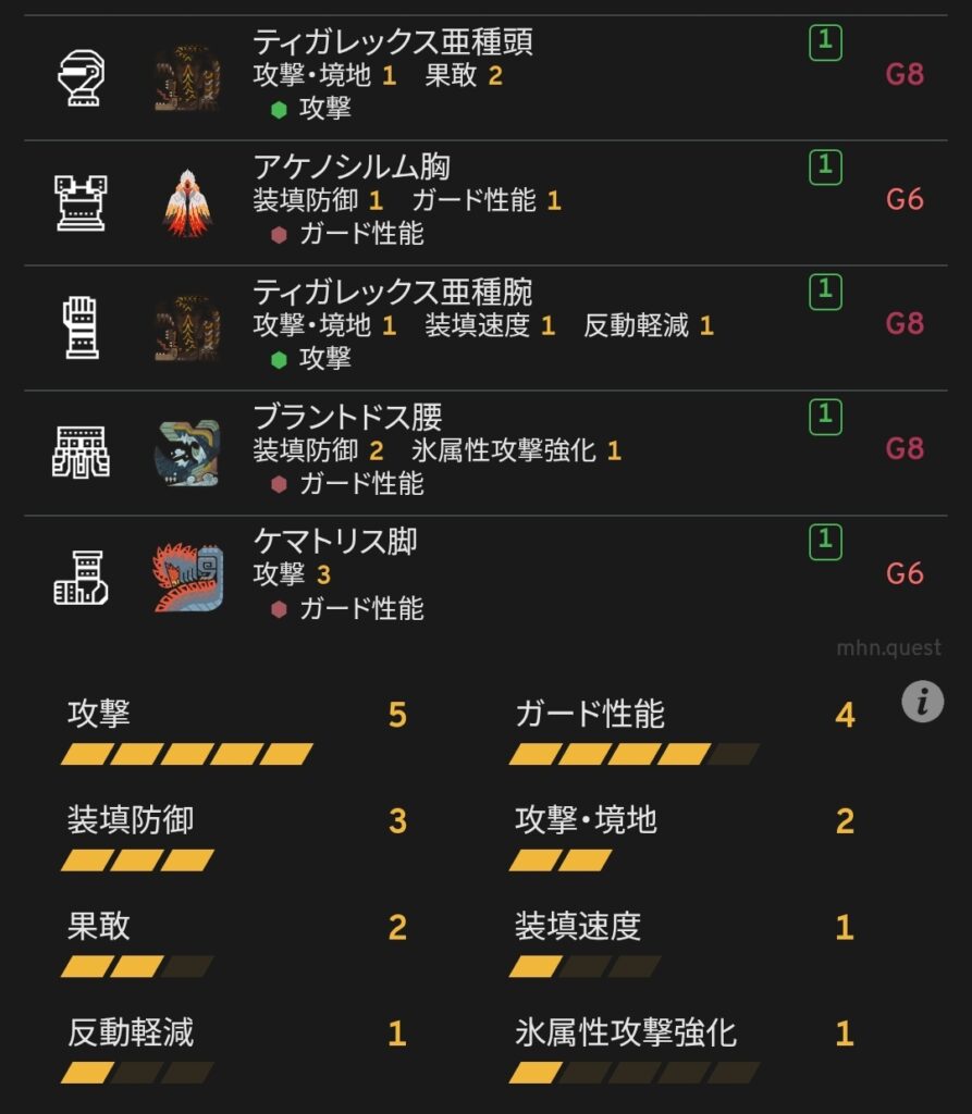 ガードリロードのヘビィで汎用的に使う装備です。ガードリロードの場合装填速度を完全に切れるので、ティガ亜種腕の装填速度1がやや無駄ですがG10まで上げてしまっているので防御力との兼ね合いで採用しています。まあ攻撃境地構成の場合他の部位使うよりも腕採用した方が効率が良いので悪くはないですかね。